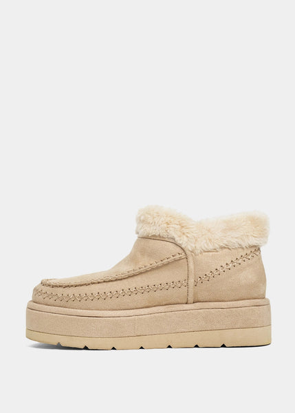 Soft, neutral, and endlessly wearable-ULLA in Bone Suede brings a fresh twist to cozy winter styling. With its tonal whipstitch details, plush faux shearling trim, and elevated sole, this bootie feels both grounded and elevated. Pair it with knits, denim, or loungewear for a snug-yet-stylish cold weather look.