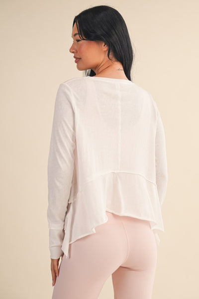 Lightweight cotton-poly blend top with long sleeves, round neckline, and asymmetrical peplum.