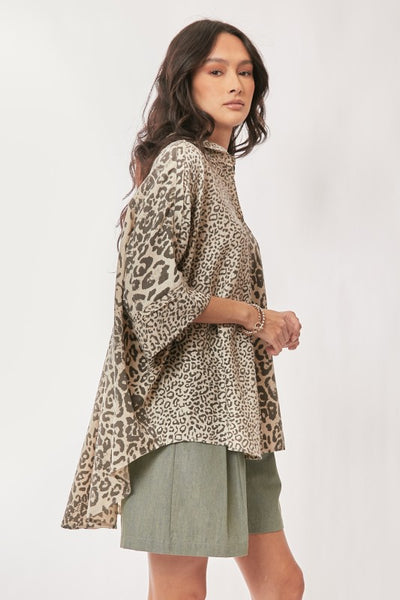 Oversized, animal print shirt is designed with soft drape, flowing high-low hem, drop shoulders, button front, patch pocket, back pleats, and half sleeves.