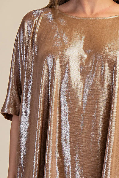 Solid, shimmering, oversized knit top featuring round neckline, half dolman sleeves and flattering silhouette.