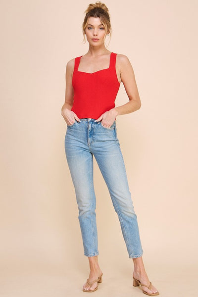 Techno, stretch ribbed tank with wide straps, small v'd square neck and fitted style.