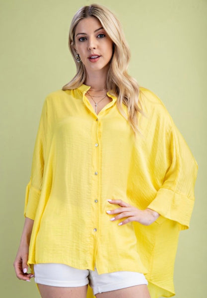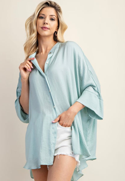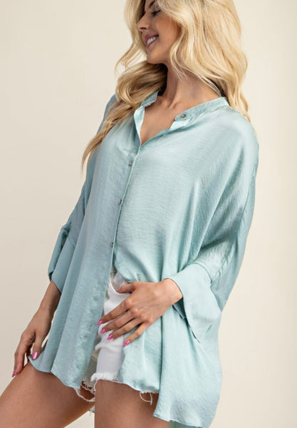 Washed satin button down loose fit top with hi-lo hem