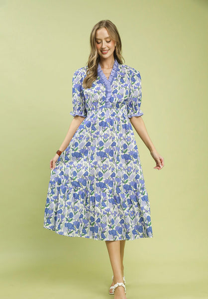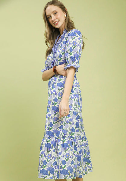 Floral Ruffle Trim Tiered Midi DressKey Features• A-line midi with elastic waist• Split neckline with contrast ruffle trim• Short puff sleeves• Has pockets• Lace trim • Not Lined Fabric Contents• 100% Cotton