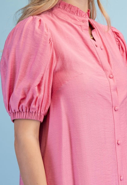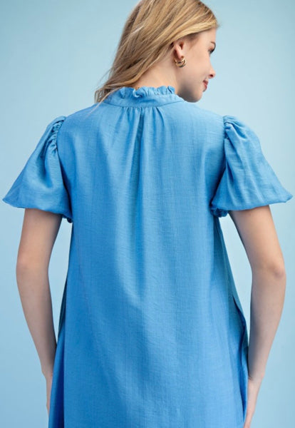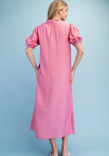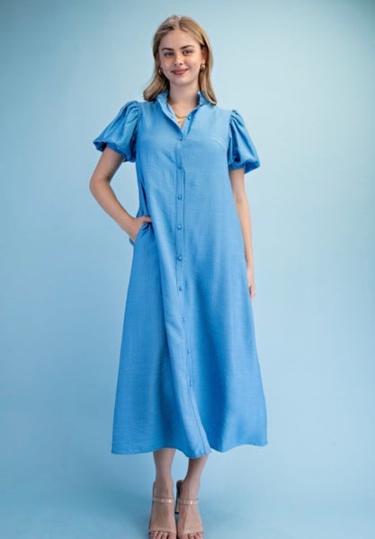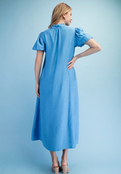 Button down lined midi dress with a ruffled collar and elastic banded arms.