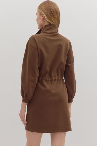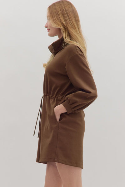 Solid long sleeve mini dress featuring half zip at front and adjustable drawstring waist. Side pockets. Unlined. Knit. Non-sheer. Medium weight.