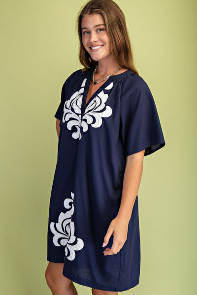 Linen blend, lined shift dress with large, embroidered applique details, v-neckline, half sleeves, and gather back.