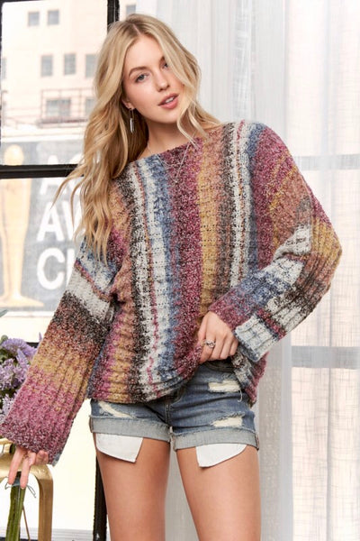 Multi-colored, multi-stripe patterned pullover sweater features boat neckline, 3/4 dolman sleeves, and all the comfort and coziness you can handle.