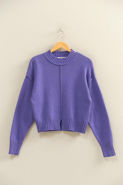 Front seam, pullover sweater with small slit at front hem, extended shoulders, long sleeves, ribbed mock neck, cuffs. and hem.