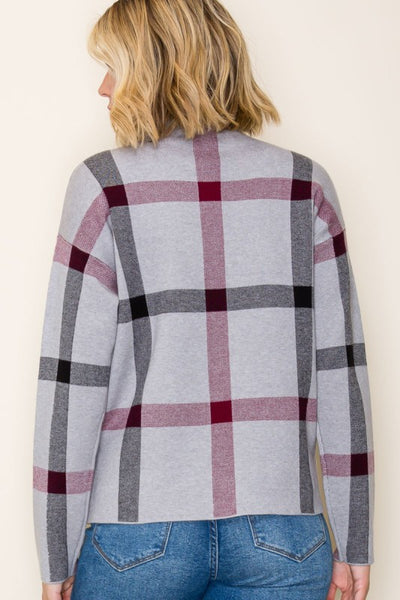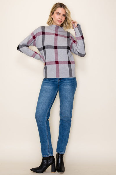 This heavy pullover sweater features a mock neck, long dolman sleeves, and a large size, eye-catching checkered pattern.