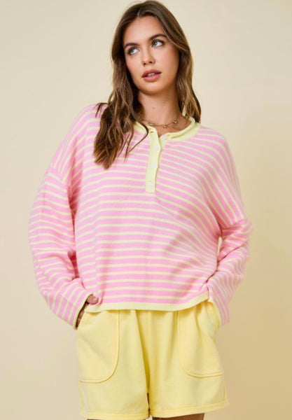 Striped henley neck knit top with dropped shoulders