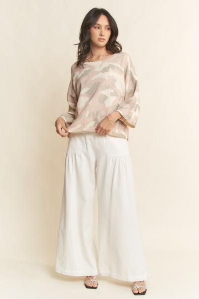Loose fit, military camo. pullover sweater features wide long sleeves, scoop neck for layering, and side slits.