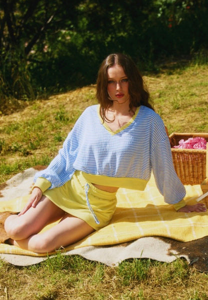 Blue and yellow v-neck stripped contrast details crop top. 100% polyester