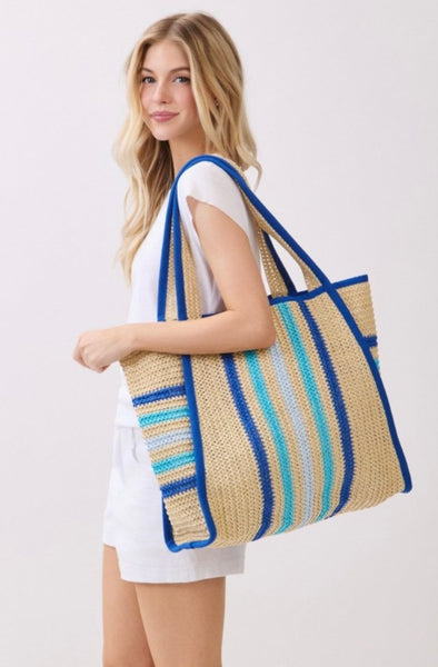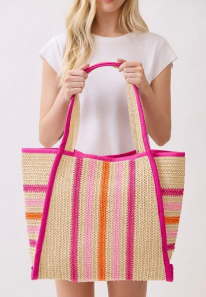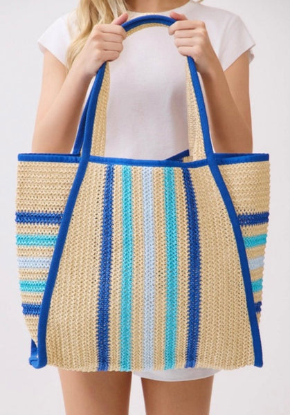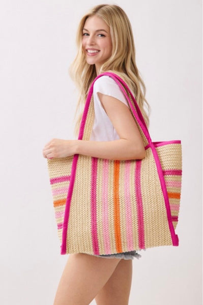 Multi color striped straw beach tote bag
