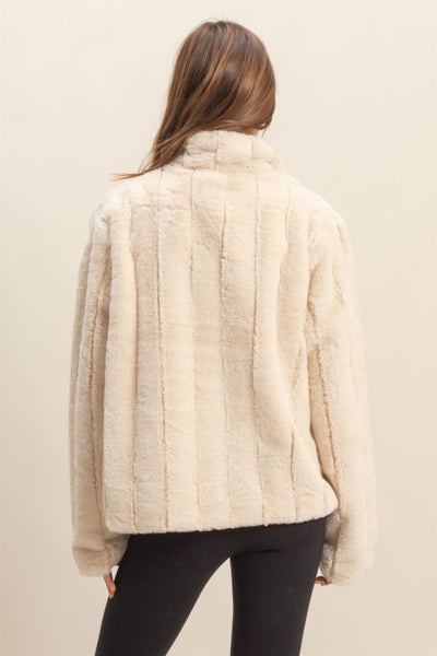 This lined, faux fur jacket is a true classic for every wardrobe. This warm and cozy number features a collared neck, long sleeves, classic fit, and hidden hook closures down the front.