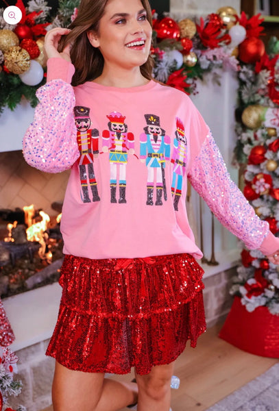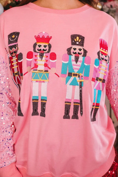 Get ready to sleigh this Christmas with this pink sweatshirt featuring embroidered nutcrackers across front and long sequined sleeves.