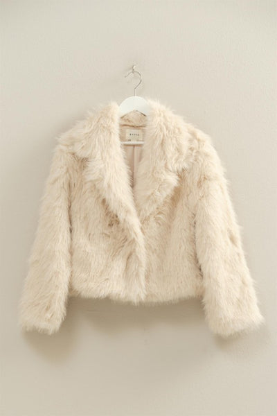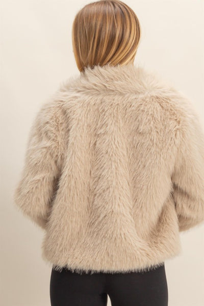 Elevate your outfit with this fully lined, faux fur jacket, perfect for adding a touch of glam. The oversized shall collar, hidden snap closure, long sleeves, and straight fit make it an ideal choice for layering